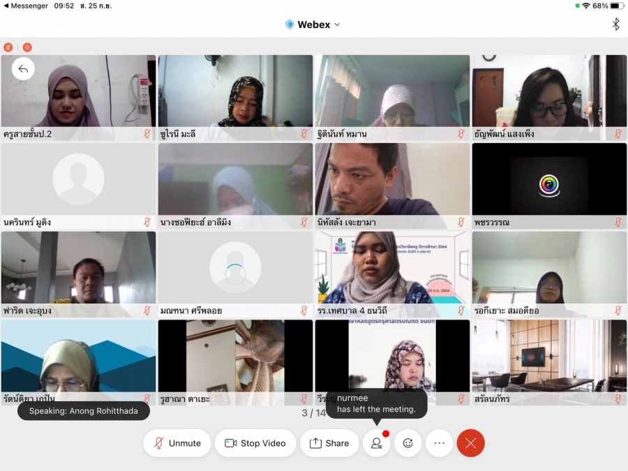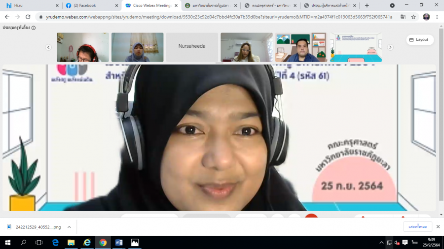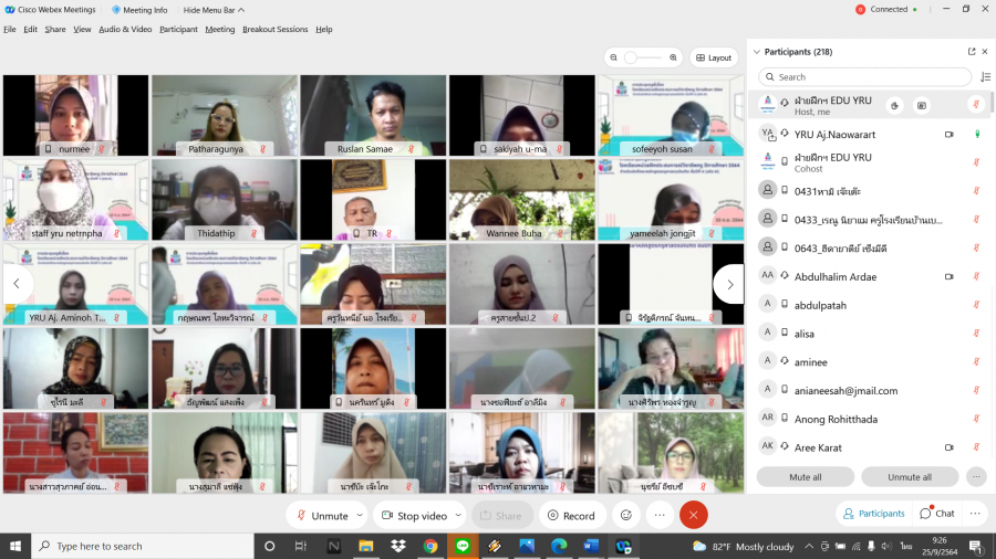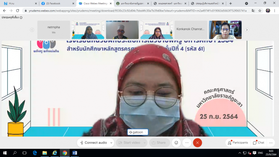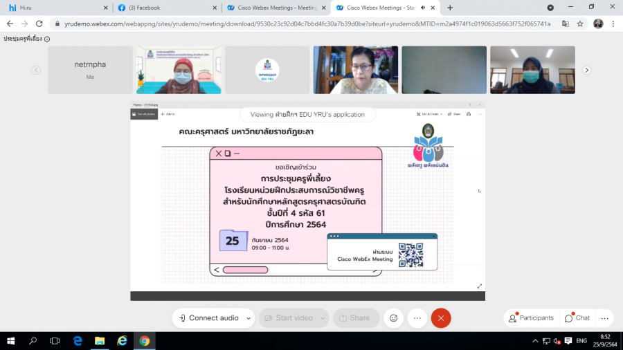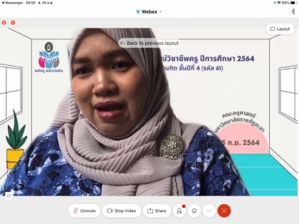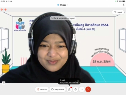 วันนี้ (25 กันยายน 2564) ฝ่ายฝึกประสบการณ์วิชาชีพครู จัดประชุมครูพี่เลี้ยง โรงเรียนหน่วยฝึกประสบการณ์วิชาชีพครู สำหรับนักศึกษาหลักสูตรครุศาสตรบัณฑิต ชั้นปีที่ 4 รหัส 61 ปีการศึกษา 2564 โดยอาจารย์เนาวรัตน์ มะลีลาเต๊ะ รองคณบดีฝ่ายวิชาการ คณะครุศาสตร์ ให้เกียรติพบปะครูพี่เลี้ยง โรงเรียนหน่วยฝึกประสบการณ์วิชาชีพครู และคณาจารย์ในหลักสูตรเข้าร่วม ผ่านระบบ Cisco Webex Meeting