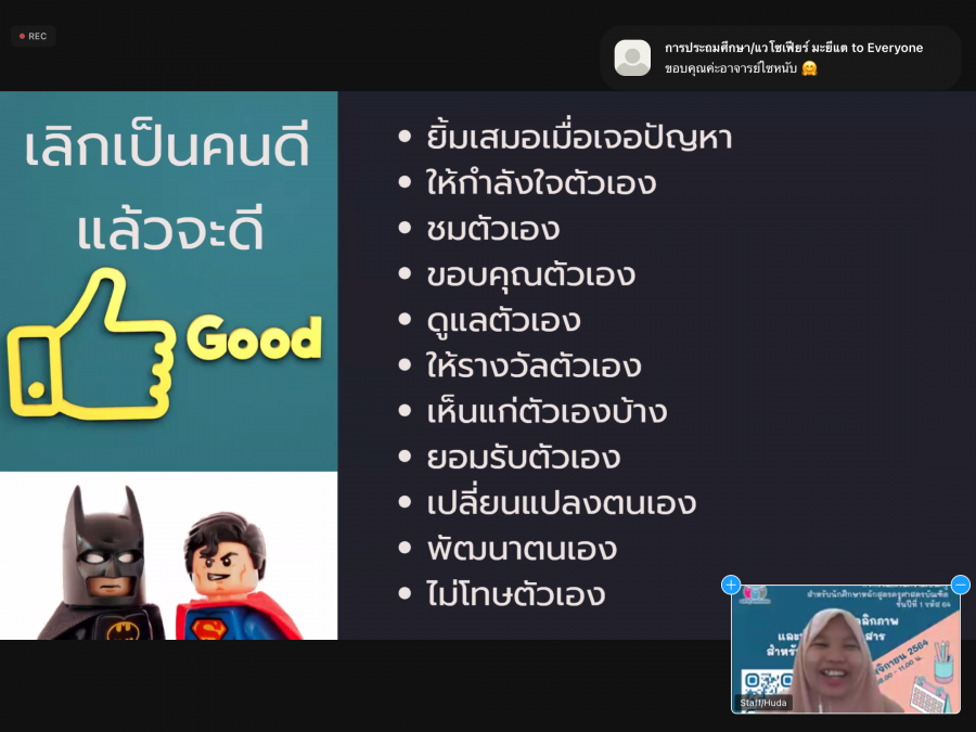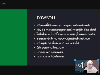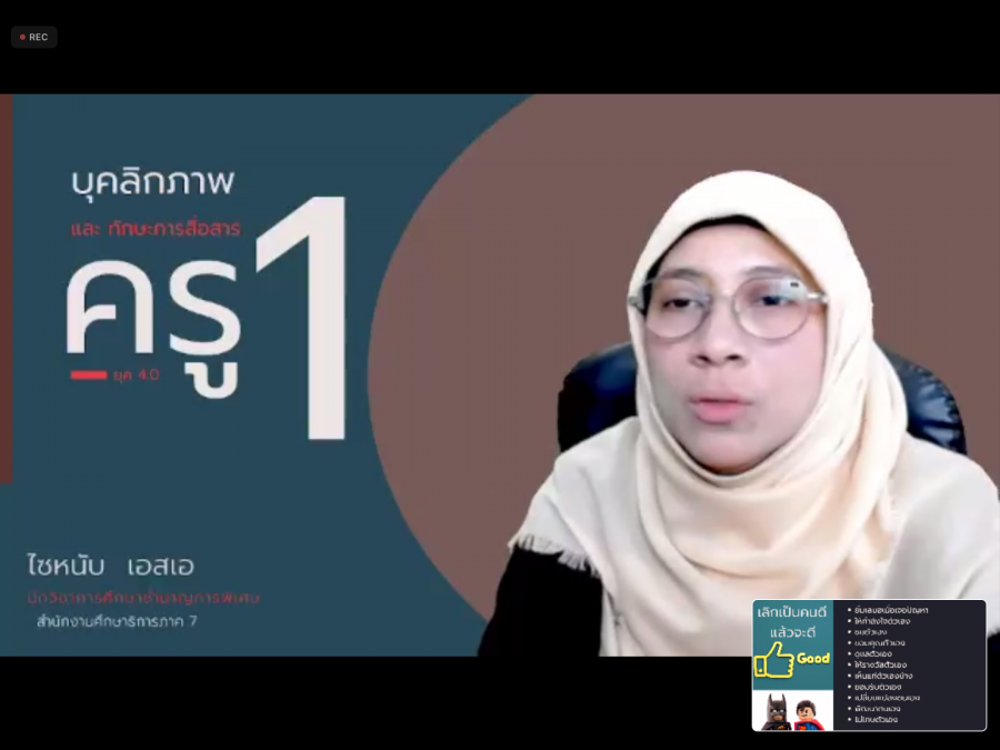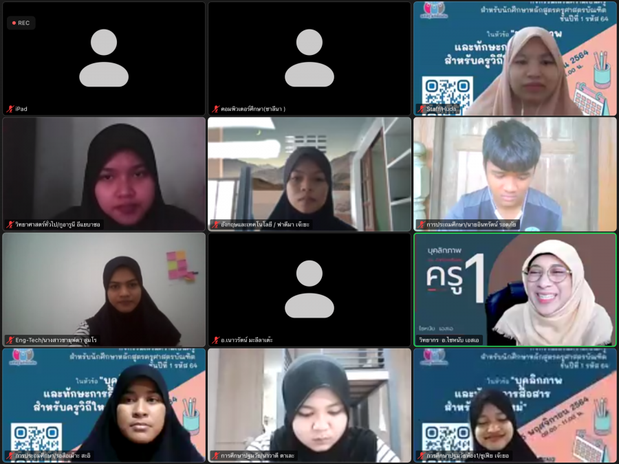 วันนี้ 15 พฤศจิกายน 2564 ฝ่ายฝึกประสบการณ์วิชาชีพครู จัดกิจกรรมเสริมความเป็นครู สำหรับนักศึกษาหลักสูตรครุศาสตรบัณฑิต ชั้นปีที่ 1 รหัส 64 ในหัวข้อ "บุคลิกภาพและทักษะการสื่อสารสำหรับครูวิถีใหม่" โดย อ.ไซหนับ เอสเอ นักวิชาการศึกษาชำนาญการพิเศษ สำนักงานศึกษาธิการ ภาค 7 จ.ยะลา ผ่านระบบ Zoom Meeting