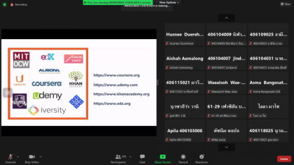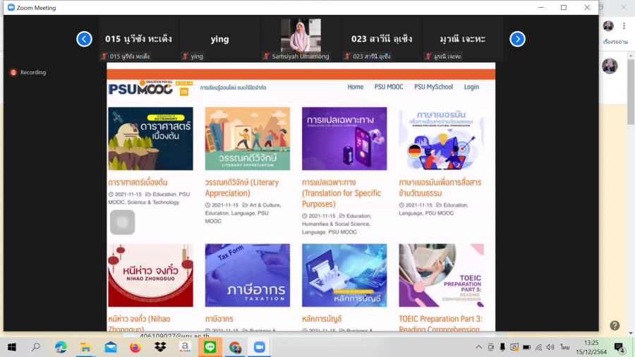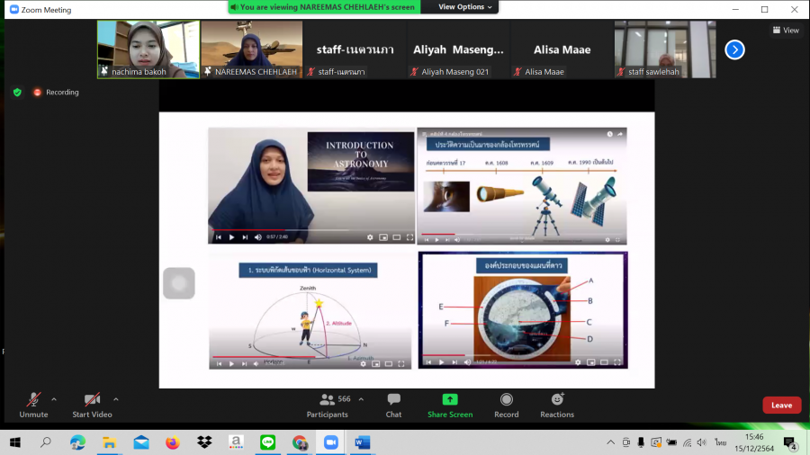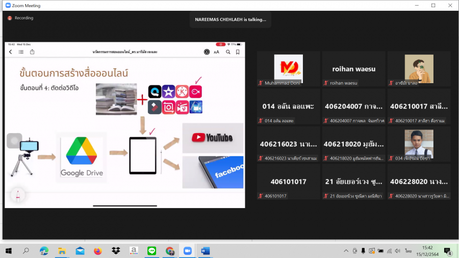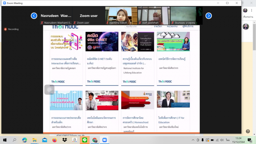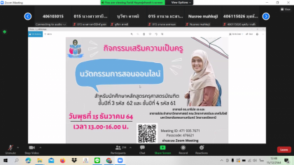 วันนี้ 15 ธันวาคม 2564 ฝ่ายฝึกประสบการณ์วิชาชีพครู จัดกิจกรรมเสริมความเป็นครู สำหรับนักศึกษาหลักสูตรครุศาสตรบัณฑิต ชั้นปีที่ 3 รหัส 62 และชั้นปีที่ 4 รหัส 61 โดยวิทยากร อาจารย์ ดร.นารีมัส เจะและ อาจารย์ประจำสาขาวิทยาศาสตร์ คณะวิทยาศาสตร์และเทคโนโลยี มหาวิทยาลัยสงขลานครินทร์ วิทยาเขตปัตตานี ในหัวข้อ นวัตกรรมการสอนออนไลน์ พร้อมด้วยคณาจารย์และบุคลากรเข้าร่วม ผ่านระบบ Zoom Meeting