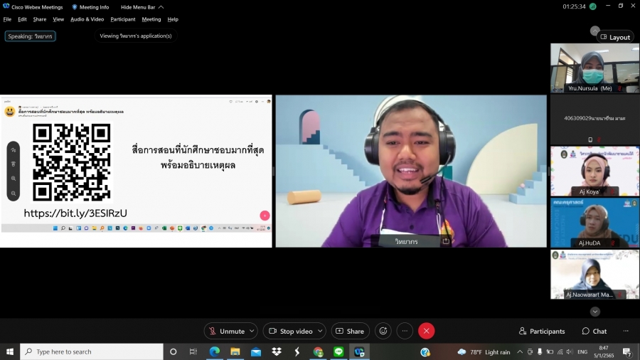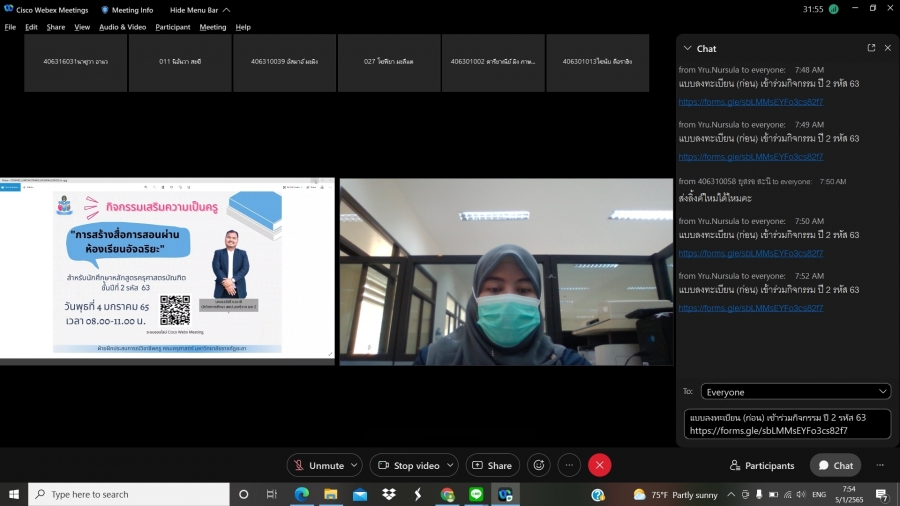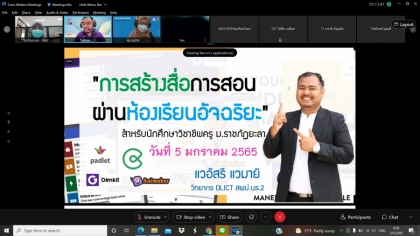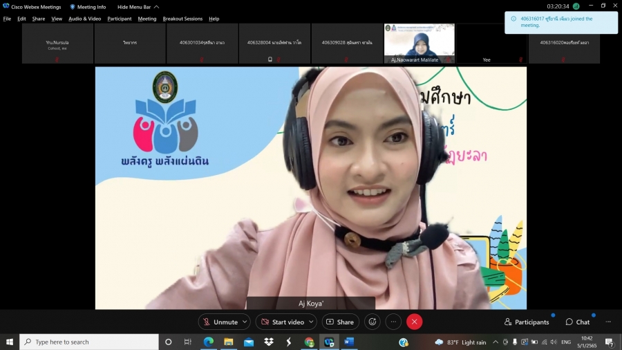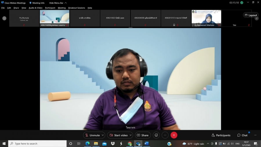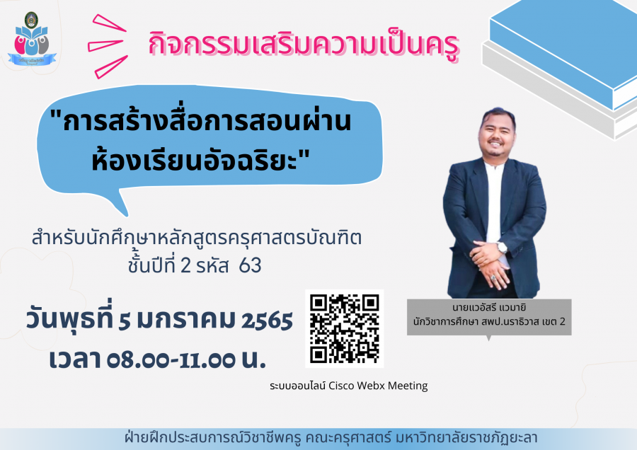 วันนี้ 5 มกราคม 2565 ฝ่ายฝึกประสบการณ์วิชาชีพครู จัดกิจกรรมเสริมความเป็นครู สำหรับนักศึกษาหลักสูตรคณะครุศาสตรบัณฑิต ชั้นปีที่ 2 รหัส 63 บรรยายพิเศษในหัวข้อ ''การสร้างสื่อการสอนผ่านห้องอัจฉริยะ'' โดยวิทยากร นายแวอัสรี แวมะยิ นักวิชาการศึกษา สพป. นราธิวาส เขต 2 มาร่วมมอบความรู้และแลกเปลี่ยนความคิดเห็นกับนักศึกษาในประเด็นดังกล่าว ผ่านช่องทางออนไลน์ในระบบ Cisco Webex Meeting