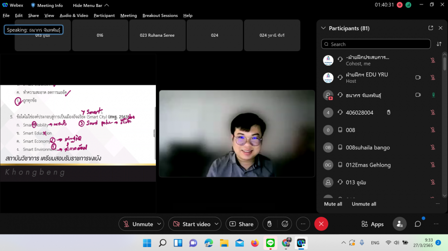 วันนี้ (27 มีนาคม 2565) ฝ่ายฝึกประสบการณ์วิชาชีพครู จัดกิจกรรมอบรมเตรียมความพร้อมเข้าสู่วิชาชีพ สำหรับนักศึกษาหลักสูตรครุศาสตรบัณฑิต ชั้นปีที่ 5 รหัส 60 ประจำปีการศึกษา 2564 วิทยากรอาจารย์ธนากร จันทพันธุ์ ในหัวข้อ ติวเข้ม มาตรฐานการจัดการเรียนการสอน และอาจารย์ธนารีย์รัฐ ชูฤทธิ์ ในหัวข้อ ติวเข้ม ภาษาอังกฤษ พร้อมด้วยคณาจารย์และบุคลากรเข้าร่วมอบรม ผ่านช่องทางออนไลน์ในระบบ Cisco Webex Meeting