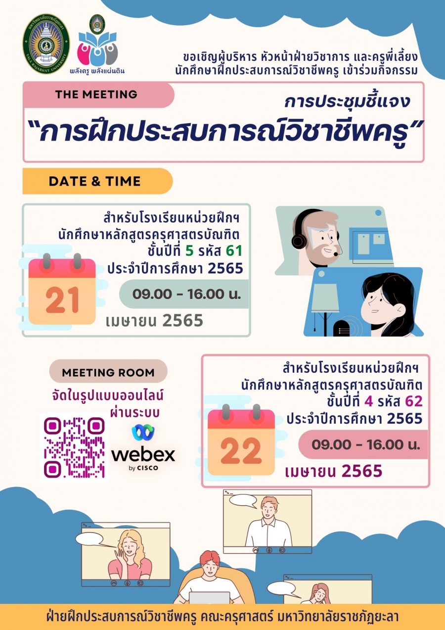 การประชุมชี้แจงเกี่ยวกับการฝึกประสบการณ์วิชาชีพครู ประจำปีการศึกษา 2565 ของนักศึกษาหลักสูตรครุศาสตรบัณฑิต ชั้นปีที่ 4 (รหัส 62)
