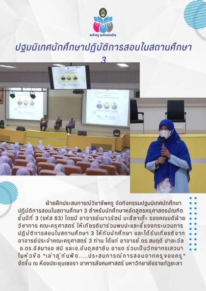 ฝ่ายฝึกประสบการณ์วิชาชีพครู จัดกิจกรรมปฐมนิเทศนักศึกษาปฏิบัติการสอนในสถานศึกษา 3 สำหรับนักศึกษาหลักสูตรครุศาสตรบัณฑิต ชั้นปีที่ 3 (รหัส 63) โดยมี อาจารย์เนาวรัตน์ มะลีลาเต๊ะ รองคณบดีฝ่ายวิชาการ คณะครุศาสตร์ ให้เกียรติมาร่วมพบปะและชี้แจงกระบวนการปฏิบัติการสอนในสถานศึกษา 3 ให้กับนักศึกษา และได้รับเกียรติจากอาจารย์ประจำคณะครุศาสตร์ 3 ท่าน ได้แก่ อาจารย์ ดร.สมฤดี ปาละวัล อาจารย์ ดร.อิสมาแอ สนิ และอาจารย์อับดุลฮาลิม อาแด ร่วมเป็นวิทยากรเสวนา ในหัวข้อ "เล่าสู่กันฟัง.....ประสบการณ์การสอนจากครูของครู" จัดขึ้น ณ ห้องประชุมเซอรา อาคารสังคมศาสตร์ มหาวิทยาลัยราชภัฏยะลา