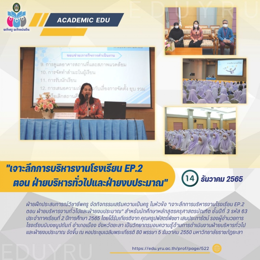 วันนี้ (14 ธันวาคม 2565) เวลา 13.00 - 16.00 น. ฝ่ายฝึกประสบการณ์วิชาชีพครู จัดกิจกรรมเสริมความเป็นครู ในหัวข้อ “เจาะลึกการบริหารงานโรงเรียน EP.2 ตอน ฝ่ายบริหารงานทั่วไปและฝ่ายงบประมาณ” สำหรับนักศึกษาหลักสูตรครุศาสตรบัณฑิต ชั้นปีที่ 3 รหัส 63 ประจำภาคเรียนที่ 2 ปีการศึกษา 2565 โดยได้รับเกียรติจาก คุณครูปพัสตร์พิชชา เสนประภารัตน์ รองผู้อำนวยการโรงเรียนนิบงชนูปถัมภ์ อำเภอเมือง จังหวัดยะลา เป็นวิทยากรมอบความรู้ด้านการดำเนินงานฝ่ายบริหารทั่วไปและฝ่ายงบประมาณ จัดขึ้น ณ หอประชุมเฉลิมพระเกียรติ 80 พรรษา 5 ธันวาคม 2550 มหาวิทยาลัยราชภัฏยะลา