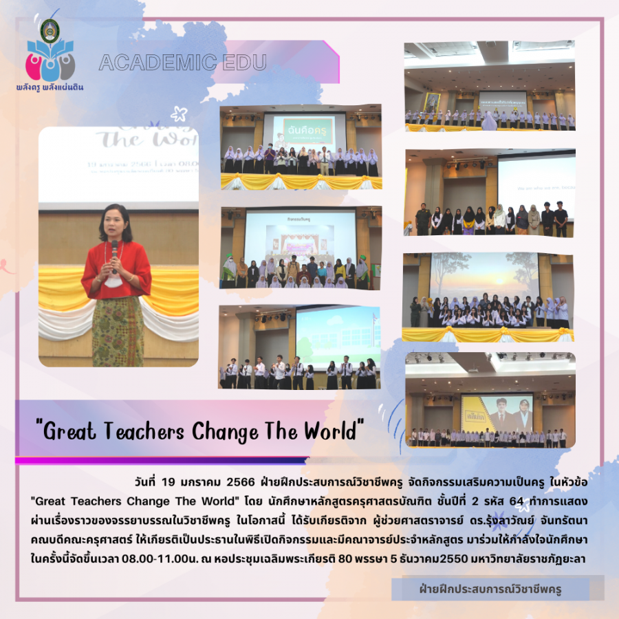 วันที่ 19 มกราคม 2566 ฝ่ายฝึกประสบการณ์วิชาชีพครู จัดกิจกรรมเสริมความเป็นครู ในหัวข้อ "Great Teachers Change The World" โดย นักศึกษาหลักสูตรครุศาสตรบัณฑิต ชั้นปีที่ 2 รหัส 64 ทำการแสดง ผ่านเรื่องราวของจรรยาบรรณในวิชาชีพครู ในโอกาสนี้ ได้รับเกียรติจาก ผู้ช่วยศาสตราจารย์ ดร.รุ้งลาวัณย์ จันทรัตนา คณบดีคณะครุศาสตร์ ให้เกียรติเป็นประธานในพิธีเปิดกิจกรรมและมีคณาจารย์ประจำหลักสูตร มาร่วมให้กำลังใจนักศึกษาในครั้งนี้จัดขึ้นเวลา 08.00-11.00น. ณ หอประชุมเฉลิมพระเกียรติ 80 พรรษา 5 ธันวาคม2550 มหาวิทยาลัยราชภัฏยะลา