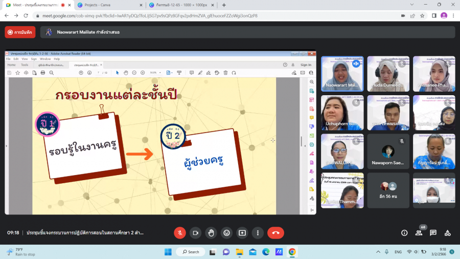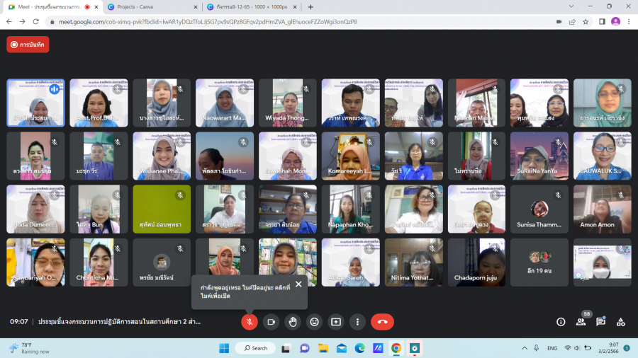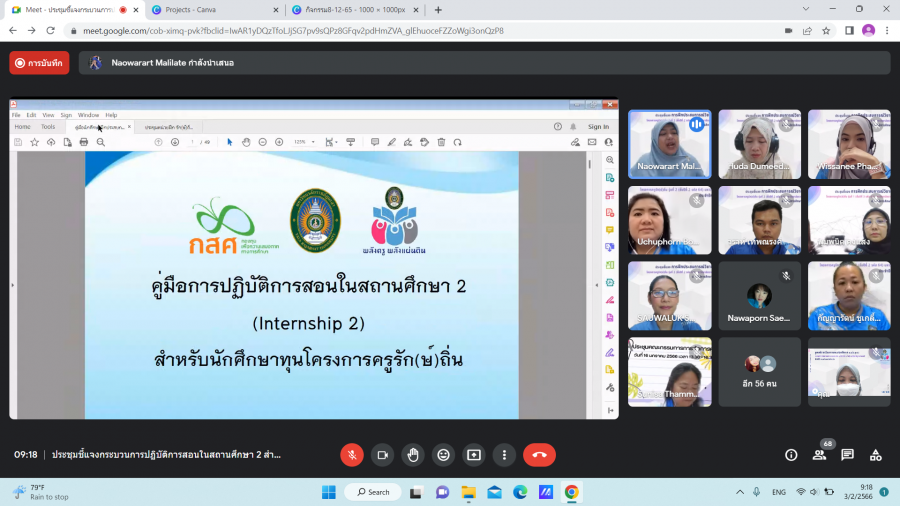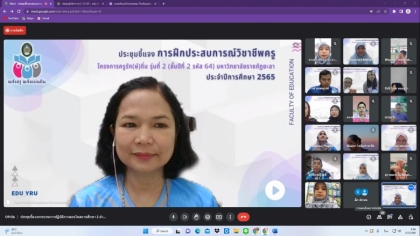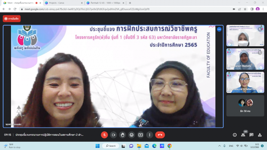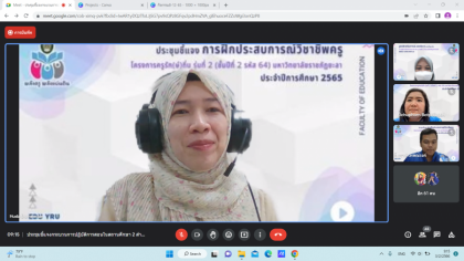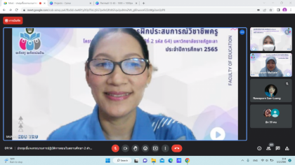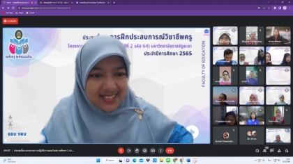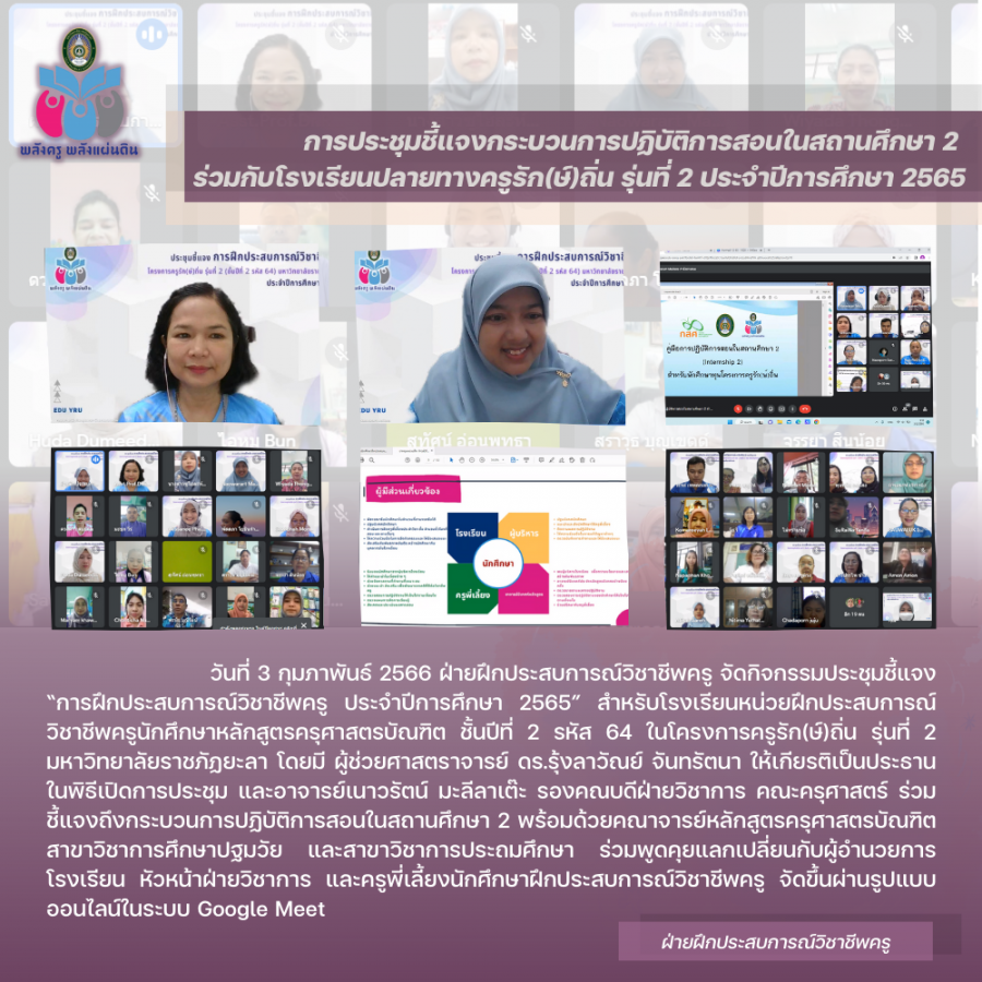วันที่ 3 กุมภาพันธ์ 2566 ฝ่ายฝึกประสบการณ์วิชาชีพครู จัดกิจกรรมประชุมชี้แจง “การฝึกประสบการณ์วิชาชีพครู ประจำปีการศึกษา 2565” สำหรับโรงเรียนหน่วยฝึกประสบการณ์วิชาชีพครูนักศึกษาหลักสูตรครุศาสตรบัณฑิต ชั้นปีที่ 2 รหัส 64 ในโครงการครูรัก(ษ์)ถิ่น รุ่นที่ 2 มหาวิทยาลัยราชภัฏยะลา โดยมี ผู้ช่วยศาสตราจารย์ ดร.รุ้งลาวัณย์ จันทรัตนา ให้เกียรติเป็นประธานในพิธีเปิดการประชุม และอาจารย์เนาวรัตน์ มะลีลาเต๊ะ รองคณบดีฝ่ายวิชาการ คณะครุศาสตร์ ร่วมชี้แจงถึงกระบวนการปฏิบัติการสอนในสถานศึกษา 2 พร้อมด้วยคณาจารย์หลักสูตรครุศาสตรบัณฑิต สาขาวิชาการศึกษาปฐมวัย และสาขาวิชาการประถมศึกษา ร่วมพูดคุยแลกเปลี่ยนกับผู้อำนวยการโรงเรียน หัวหน้าฝ่ายวิชาการ และครูพี่เลี้ยงนักศึกษาฝึกประสบการณ์วิชาชีพครู จัดขึ้นผ่านรูปแบบออนไลน์ในระบบ Google Meet
