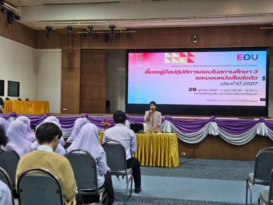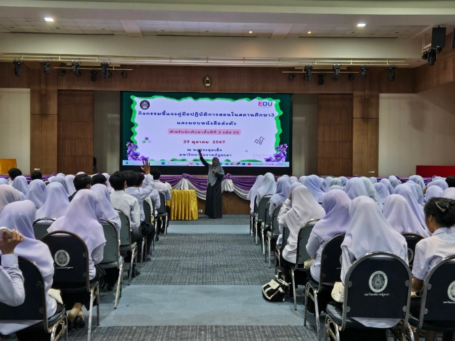 วันที่ 29 ตุลาคม 2567 เวลา 08.30 - 12.00 น. อาจารย์จันจลี ถนอมลิขิตวงศ์ รองคณบดีฝ่ายวิชาการคณะครุศศาสตร์ เปิดพิธีและให้โอวาทนักศึกษา ในกิจกรรมชี้แจงคู่มือปฏิบัติการสอนในสถานศึกษา 3 และมอบหนังสือส่งตัว สำหรับนักศึกษาหลักสูตรครุศาสตรบัณฑิต ชั้นปีที่ 3 รหัส 65 โดยมี อาจารย์เนาวรัตน์ มะลีลาเต๊ะ หัวหน้าฝ่ายฝึกประสบการณ์วิชาชีพครู คณะครุศาสตร์ ชี้แจงเกี่ยวกับคู่มือฯและการเตรียมความพร้อมก่อนปฏิบัติการสอนในสถานศึกษา 3 พร้อมด้วยคณาจารย์หลักสูตรครุศาสตรบัณฑิต และคณาจารย์ฝ่ายฝึกประสบการณ์วิชาชีพครู คณะครุศาสตร์ ร่วมพบปะและส่งกำลังใจให้นักศึกษา จัดขึ้น ณ หอประชุมเล็ก มหาวิทยาลัยราชภัฏยะลา