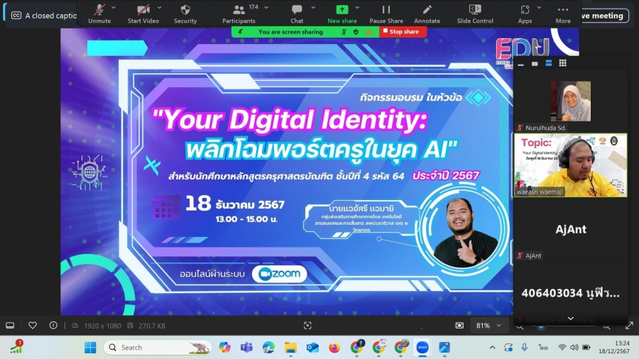 วันที่ 18 ธันวาคม 2567 เวลา 13.00 - 15.00 น. ฝ่ายฝึกประสบการณ์วิชาชีพครู จัดกิจกรรมอบรม ในหัวข้อ "Your Digital Identity: พลิกโฉมพอร์ตครูในยุค AI" สำหรับนักศึกษาหลักสูตรครุศาสตรบัณฑิต ชั้นปีที่ 4 รหัส 64 โดยได้รับเกียรติจาก ครูยี แวอัสรี แวมายิ จากสำนักงานเขตพื้นที่การศึกษาประถมศึกษานราธิวาส เขต 2 เป็นวิทยากร แนะแนวทางการจัดทำ E-portfolio ให้แก่นักศึกษา ผ่านรูปแบบออนไลน์ในระบบ ZOOM Meeting