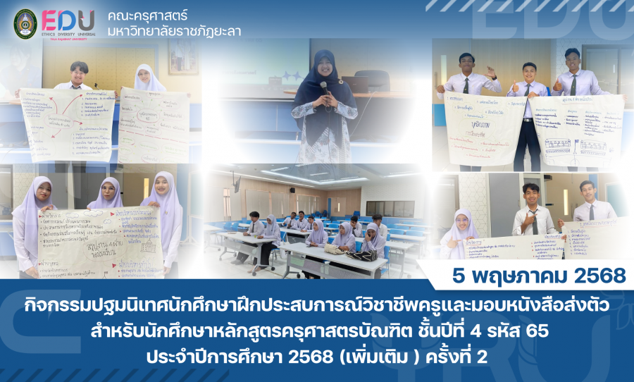 กิจกรรมปฐมนิเทศนักศึกษาฝึกประสบการณ์วิชาชีพครูและมอบหนังสือส่งตัว สำหรับนักศึกษาหลักสูตรครุศาสตรบัณฑิต ชั้นปีที่ 4 รหัส 65 สาขาวิชาคอมพิวเตอร์,สาขาพลศึกษาและสุขศึกษา,สาขาปฐมวัย ห้อง 1 โดยมี อาจารย์เนาวรัตน์ มะลีลาเต๊ะ ผู้ช่วยคณบดี คณะครุศาสตร์ ชี้แจงเกี่ยวกับคู่มือฯและการเตรียมความพร้อมก่อนปฏิบัติการสอนในสถานศึกษา 4 จัดขึ้น ณ ห้องประชุมเซียน ตาน ฮวา ชั้น 3 อาคารสังคมศาสตร์ มหาวิทยาลัยราชภัฏยะลา.