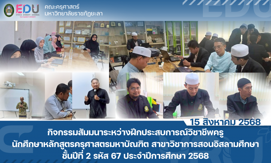 วันที่ 15 สิงหาคม 2568 เวลา 09.00 -12.00 น. ผศ.อับดุลฮาลิม อาแด อาจารย์ประจำหลักสูตรครุศาสตรบัณฑิต สาขาวิชาการสอนอิสลามศึกษา และคณาจารย์ประจำหลักสูตรครุศาสตรมหาบัณฑิต สาขาวิชาการสอนอิสลามศึกษา ร่วมเปิดพิธีกิจกรรมสัมมนาระหว่างฝึกประสบการณ์วิชาชีพครู ขั้นการปฏิบัติวิชาชีพครูสำหรับบัณฑิตศึกษา 1 ครั้งที่ 2 นักศึกษาหลักสูตรครุศาสตรมหาบัณฑิต สาขาวิชาการสอนอิสลามศึกษา ชั้นปีที่ 2 รหัส 67 ประจำปีการศึกษา 2568 โดยมีรูปแบบกิจกรรมในครั้งนี้เป็นการนำเสนอหัวข้อวิจัย พร้อมรับฟังการเสนอแนะรายบุคคลจากคณาจารย์ประจำหลักสูตร เพื่อติดตามความก้าวหน้าของการฝึกประสบการณ์วิชาชีพครู.