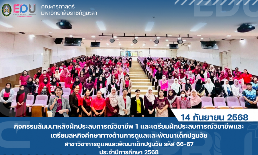 เพื่อติดตามความก้าวหน้าของการฝึกประสบการณ์วิชาชีพและร่วมกันถอดบทเรียนในหัวข้อ "การดูแลและพัฒนาเด็กปฐมวัย" โดยมีคณาจารย์ประจำหลักสูตรเข้าร่วมกิจกรรมและให้ข้อเสนอแนะแก่นักศึกษา ณ ห้องประชุมเซอรา ชั้น 2 อาคารสังคมศาสตร์ มหาวิทยาลัยราชภัฏยะลา