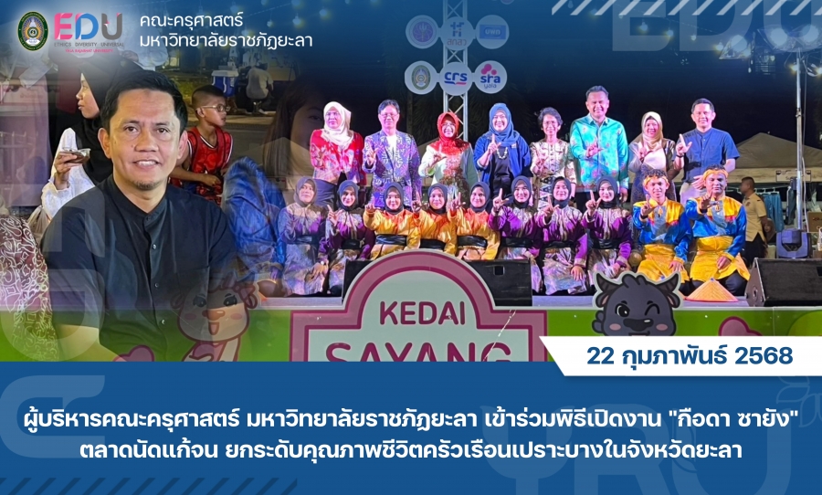 เมื่อวันที่ 22 กุมภาพันธ์ 2568 เวลา 18.00 น. ผู้บริหารคณะครุศาสตร์ มหาวิทยาลัยราชภัฏยะลา โดย ผู้ช่วยศาสตราจารย์ ดร.มูหัมมัดตอลาล แกมะ คณบดีคณะครุศาสตร์ มหาวิทยาลัยราชภัฏยะลา เข้าร่วมพิธีเปิดงาน "กือดา ซายัง" ตลาดนัดแก้จน ซึ่งจัดขึ้นโดยความร่วมมือระหว่าง มหาวิทยาลัยราชภัฏยะลา และ หน่วยบริหารและจัดการทุนด้านการพัฒนาระดับพื้นที่ (บพท.)