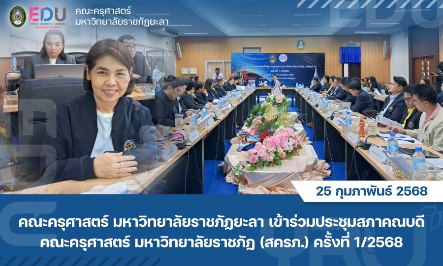 เมื่อวันอังคารที่ 25 กุมภาพันธ์ 2568 คณะผู้บริหารคณะครุศาสตร์ มหาวิทยาลัยราชภัฏยะลา โดย อาจารย์จันจลี ถนอมลิขิตวงศ์ รองคณบดีฝ่ายวิชาการ เข้าร่วมการประชุม สภาคณบดีคณะครุศาสตร์ มหาวิทยาลัยราชภัฏ (สครภ.) ครั้งที่ 1/2568 ณ มหาวิทยาลัยราชภัฏเลย จังหวัดเลย