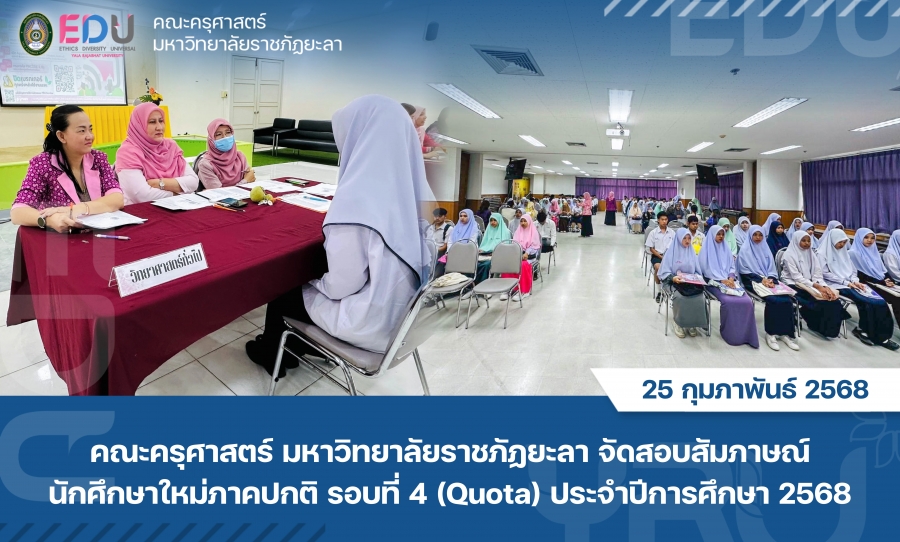 คณะครุศาสตร์ มหาวิทยาลัยราชภัฏยะลา ดำเนินการสอบสัมภาษณ์นักศึกษาใหม่ ระดับปริญญาตรี ภาคปกติ รอบที่ 4 (Quota) ประจำปีการศึกษา 2568 สำหรับ ประเภทผลการเรียนดี ประเภทความสามารถพิเศษ ประเภทกิจกรรมเด่น และประเภทครอบครัวยากจนได้เปรียบ ใน หลักสูตรครุศาสตรบัณฑิต
