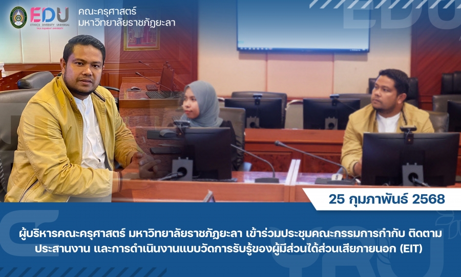 วันนี้ วันอังคาร ที่ 25 กุมภาพันธ์ ๒๕๖๘ เวลา 13.30 น. ผู้บริหารคณะครุศาสตร์ มหาวิทยาลัยราชภัฏยะลา โดย อาจารย์ ดร.อิสมาแอ สนิ รองคณบดีฝ่ายบริหาร วิจัยและพัฒนาท้องถิ่น เข้าร่วมประชุมคณะกรรมการกำกับ ติดตาม ประสานงาน และการดำเนินงานแบบวัดการรับรู้ของผู้มีส่วนได้ส่วนเสียภายนอก (EIT) โดยมีอาจารย์สุวิมล อิสระธนาชัยกุล ผู้อำนวยการสำนักงานประกันคุณภาพเป็นประธานในการประชุม และมีผู้บริหารและบุคลากรจาก 7 ส่วนราชการ เข้าร่วมประชุม ณ ห้องประชุมสภา ชั้น 2 อาคารเฉลิมพระเกียรติ 50 พรรษา มหาวชิราลงกรณ