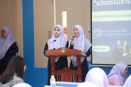 ผู้ช่วยศาสตราจารย์ ดร.มูหัมมัดตอลาล แกมะ คณบดีคณะครุศาสตร์ กล่าวแสดงความยินดีกับนักศึกษาที่เข้าร่วมประกวดในครั้งนี้ พร้อมเน้นย้ำถึงความสำคัญของการพัฒนานวัตกรรมทางการศึกษา ที่สามารถนำไปประยุกต์ใช้กับการเรียนการสอนในโรงเรียนและชุมชน และยังเปิดโอกาสให้นักศึกษาได้แลกเปลี่ยนแนวคิดกับเพื่อนร่วมวิชาชีพ รวมถึงการต่อยอดผลงานเพื่อพัฒนาต่อไป