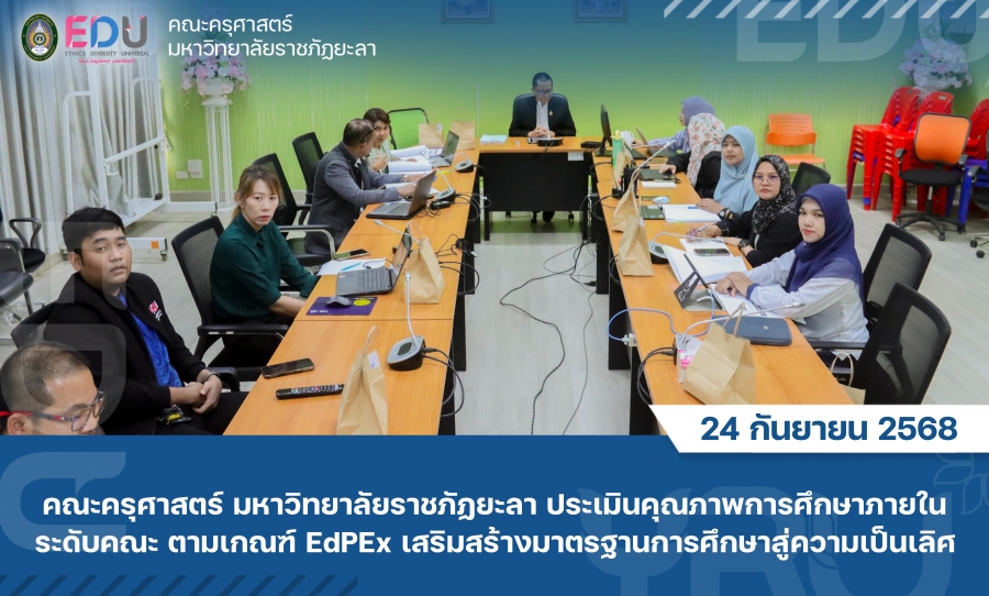 วันที่ 24 กันยายน 2568 คณะครุศาสตร์ มหาวิทยาลัยราชภัฏยะลา ประเมินคุณภาพการศึกษาภายในระดับคณะ ประจำปีการศึกษา 2567 ตามเกณฑ์การประเมินคุณภาพการศึกษาเพื่อการดำเนินการที่เป็นเลิศ (Education Criteria for Performance Excellence : EdPEx) โดยจัดขึ้นในรูปแบบกึ่งออนไลน์ (Hybrid) ผ่านระบบ Google Meet ภายใต้โครงการพัฒนาและส่งเสริมการประเมินคุณภาพหลักสูตรตามมาตรฐานสากล (AUNQA, EdPEx)