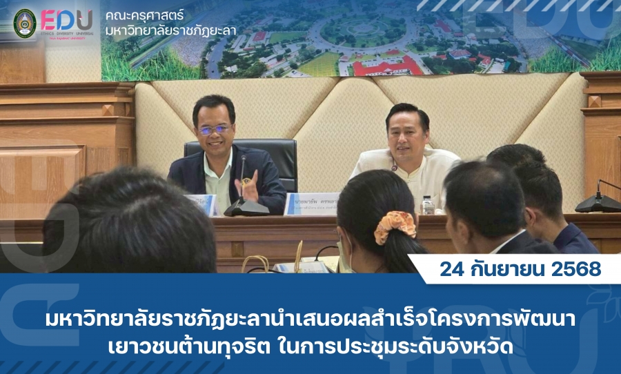 24 กันยายน 2568 - มหาวิทยาลัยราชภัฏยะลา โดย ผศ.กรัณฑรักข์ วิทยอภิบาลกุล ผู้อำนวยการโรงเรียนสาธิตมหาวิทยาลัยราชภัฏยะลา ในฐานะผู้แทนมหาวิทยาลัย พร้อมด้วยนางสาวกรัณฑรัตน์ เติมวิทย์ขจร รักษาการในตำแหน่งผู้อำนวยการสำนักงานคณบดี และนายสุรเดช ทองทวี เจ้าหน้าที่เทคโนโลยีสารสนเทศ ได้เข้าร่วมนำเสนอผลการดำเนินงานโครงการ "พัฒนาเยาวชน รู้เท่าทัน สร้างสรรค์สื่อ ป้องปรามทุจริต" รอบ 12 เดือน