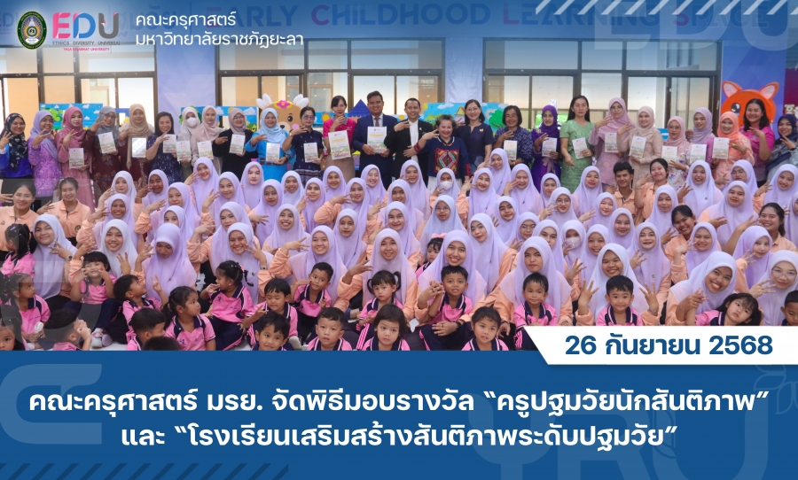เมื่อวันที่ 26 กันยายน 2568 หลักสูตรครุศาสตรบัณฑิต สาขาวิชาการศึกษาปฐมวัย คณะครุศาสตร์ มหาวิทยาลัยราชภัฏยะลา ได้จัดพิธีมอบรางวัล “ครูปฐมวัยนักสันติภาพ” แก่ครูผู้ส่งผลงานภายใต้หัวข้อที่กำหนด โดยได้รับเกียรติจาก ผู้ช่วยศาสตราจารย์ ดร.มูหัมมัดตอลาล แกมะ คณบดีคณะครุศาสตร์ เป็นประธานในพิธี ณ ลาน Early Learning Space ชั้น 2 คณะครุศาสตร์ ในโอกาสเดียวกัน ได้มีการมอบรางวัล “โรงเรียนเสริมสร้างสันติภาพระดับปฐมวัย” ให้แก่สถานศึกษาที่ผ่านการพิจารณา ได้แก่ โรงเรียนสาธิตมหาวิทยาลัยราชภัฏยะลา และโรงเรียนอนุบาลเบตง (สุภาพอนุสรณ์)