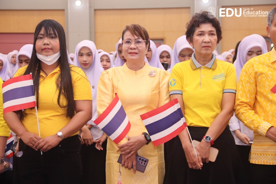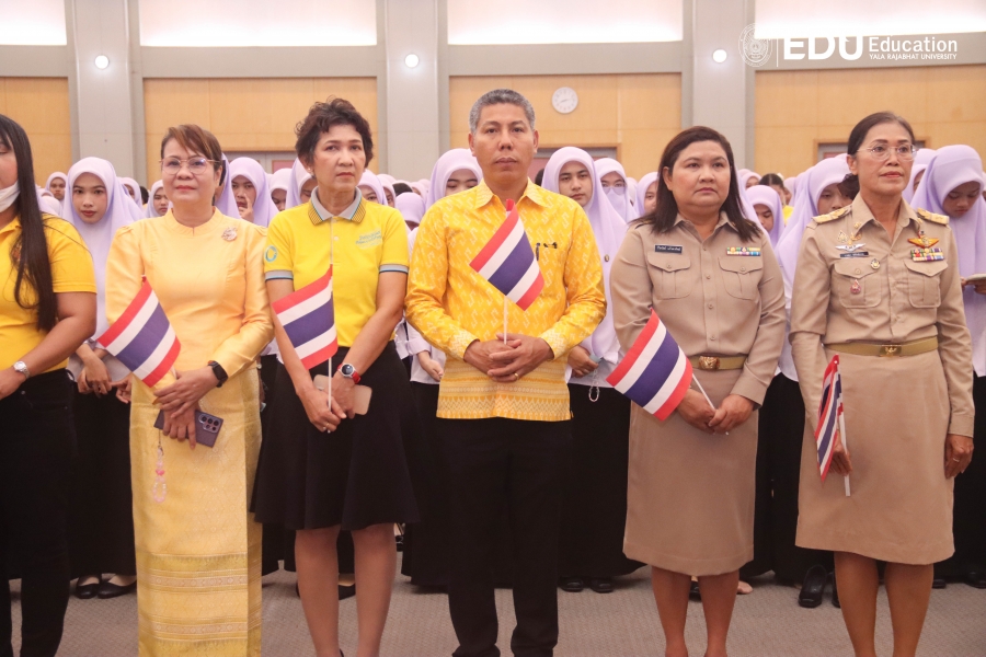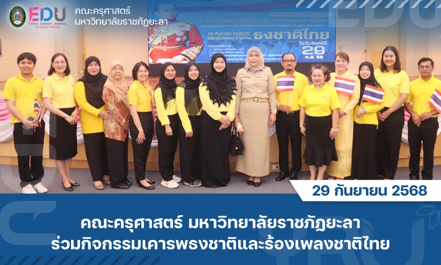 เมื่อวันที่ 29 กันยายน 2568 คณะครุศาสตร์ มหาวิทยาลัยราชภัฏยะลา ได้เข้าร่วมกิจกรรม “เคารพธงชาติ และร้องเพลงชาติไทย” ณ หอประชุมเฉลิมพระเกียรติ 80 พรรษา 5 ธันวาคม 2550 มหาวิทยาลัยราชภัฏยะลา โดยมี ผู้ช่วยศาสตราจารย์ ดร.เกสรี ลัดเลีย รองอธิการบดี รักษาราชการแทนอธิการบดีมหาวิทยาลัยราชภัฏยะลา เป็นประธานในพิธี พร้อมด้วยผู้บริหาร คณาจารย์ บุคลากร และนักศึกษาเข้าร่วมอย่างพร้อมเพรียง
