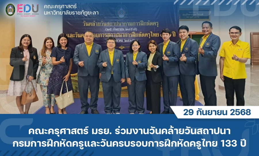 เมื่อวันที่ 29 กันยายน 2568 คณะครุศาสตร์ มหาวิทยาลัยราชภัฏยะลา เข้าร่วมงาน “วันคล้ายวันสถาปนากรมการฝึกหัดครู (29 กันยายน 2497) และวันครบรอบการฝึกหัดครูไทย 133 ปี (12 ตุลาคม 2435)” ประจำปี พ.ศ. 2568 ณ มหาวิทยาลัยราชภัฏพระนคร โดยได้รับเกียรติจาก พลเอกดาว์พงษ์ รัตนสุวรรณ องคมนตรี เป็นประธานในพิธี