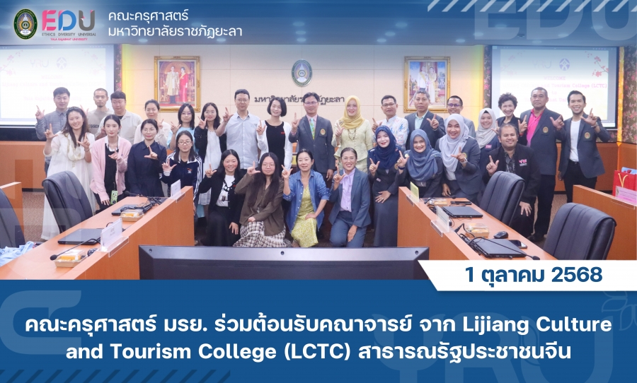 เมื่อวันที่ 1 ตุลาคม 2568 คณะครุศาสตร์ มหาวิทยาลัยราชภัฏยะลา ร่วมต้อนรับคณาจารย์จาก Lijiang Culture and Tourism College (LCTC) สาธารณรัฐประชาชนจีน โดยมี ผู้ช่วยศาสตราจารย์ ดร.มูหัมมัดตอลาล แกมะ คณบดีคณะครุศาสตร์ พร้อมด้วย อาจารย์สาริศา โตะหะ อาจารย์ผู้แทนคณะครุศาสตร์ เข้าร่วมต้อนรับ ณ ห้องประชุมจันทน์กะพ้อ ชั้น 3 อาคารเฉลิมพระเกียรติ 50 พรรษา มหาวชิราลงกรณ โดยมี ผู้ช่วยศาสตราจารย์ ดร.ศิริชัย นามบุรี อธิการบดีมหาวิทยาลัยราชภัฏยะลา เป็นประธานในการให้การต้อนรับ