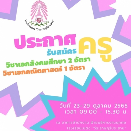 ประกาศรับสมัครคัดเลือกบุคคลเพื่อจ้างเป็นลูกจ้างชั่วคราว ตำแหน่งครูผู้สอน วิชาเอกคณิตศาสตร์ 1 อัตรา วิชาเอกสังคมศึกษา 2 อัตรา ตั้งแต่วันที่ 23-29 ตุลาคม 2565 เพจโรงเรียน : โรงเรียนเบตง "วีระราษฎร์ประสาน"